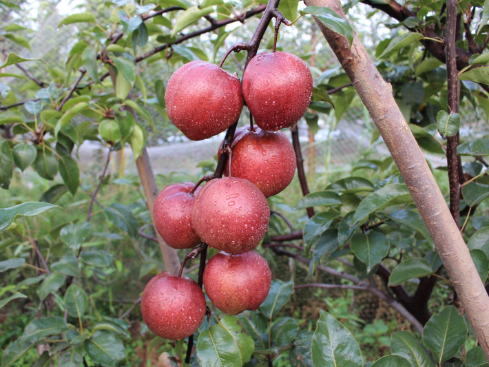 早酥紅梨的全紅型芽變,8月初成熟,幼果成熟后為紫紅色,果肉潔白,可溶性固形物含量15%,果形較正,果實橫徑增大,縱徑減小,平均果重360克,大果600克,畝效益可達3-8萬元。
