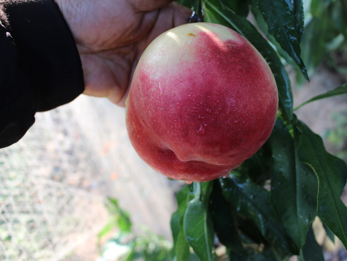 9月5日成熟,果面紅色,果肉白色,均果重400克,大果700克,含糖18%,硬度好,口感甜,可掛樹一個月不軟,自花授粉極豐產(chǎn)。